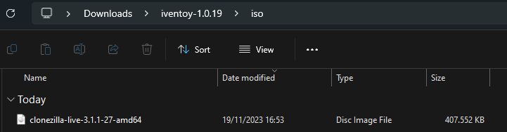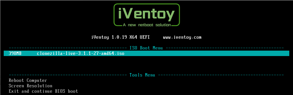 Unpack the iVentoy ZIP and add the CloneZilla ISO to iVentoy's ISO folder.