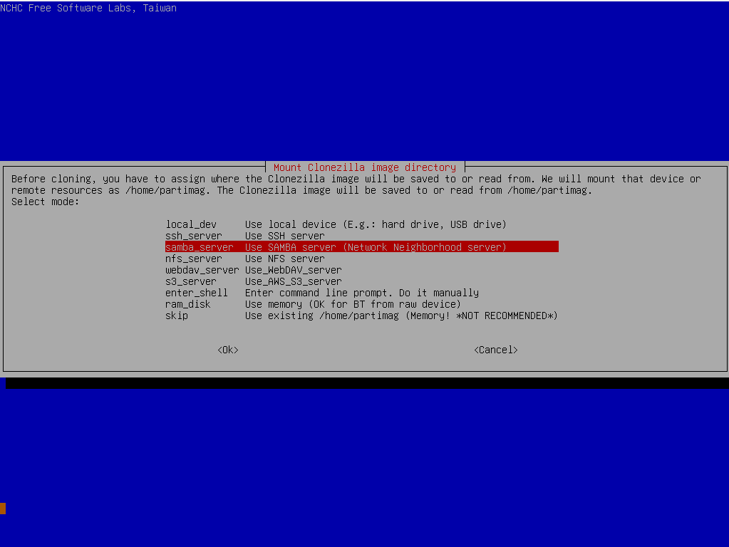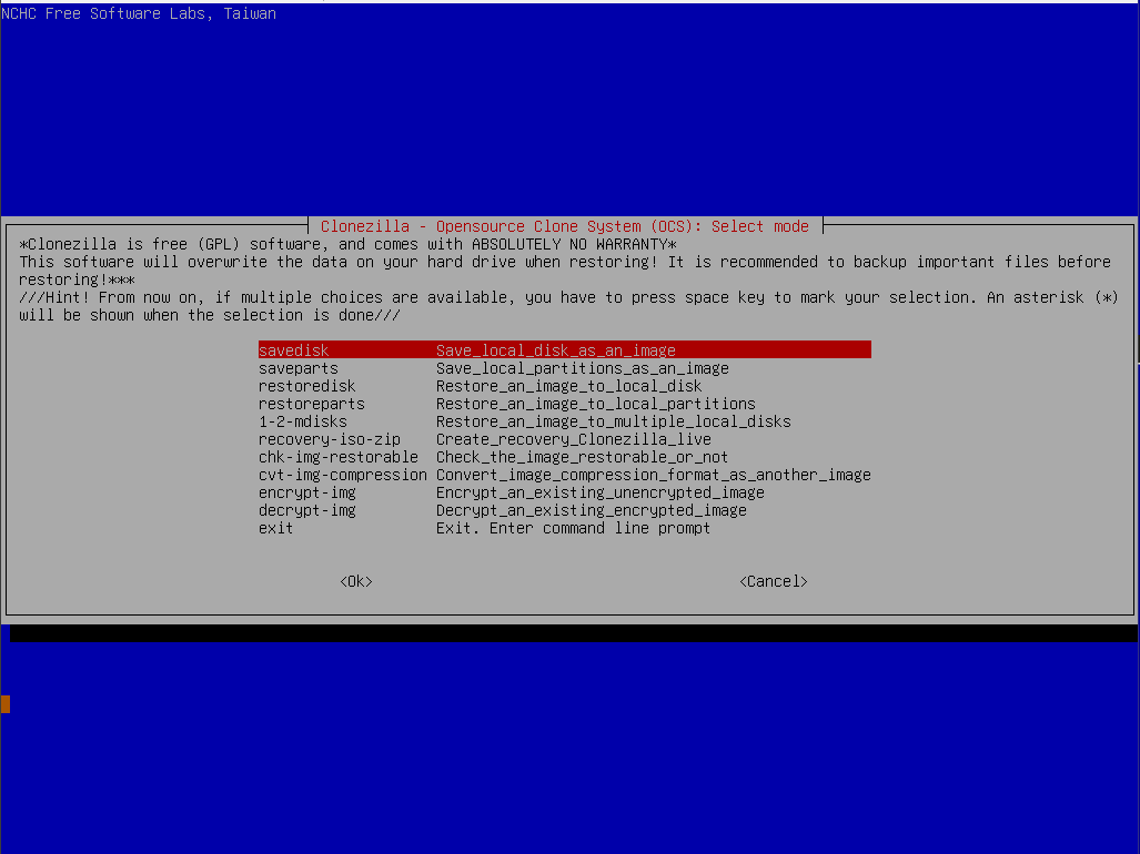 Select either savedisk or restoredisk, savedisk will save the disk image to the SMB-share, restoredisk will allow for restoring disk images from the SMB-share.