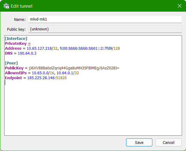 Open your WireGuard client and import the configuration file, after importing it click edit and change the AllowedIPs to 10.65.0.0/16, 10.64.0.1/32